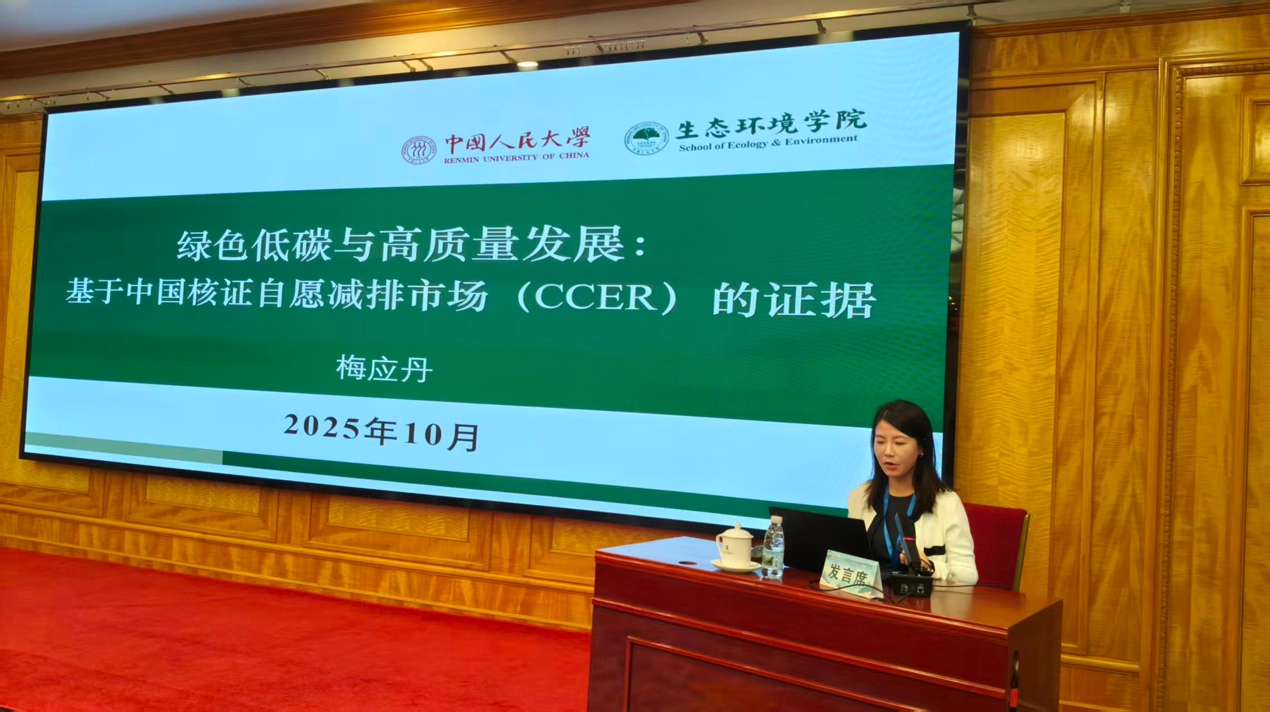 本次会议期间,我院梅应丹副教授受邀参加“资源环境要素市场建设与政策创新”议题的分会场,并作了题为“绿色低碳与高质量发展:基于中国核证自愿减排市场(CCER)的证据”的学术报告,从高质量发展的内涵出发阐释了CCER是一种将“绿色低碳”与“高质量发展”内在统一的关键机制,并从“CCER与创新”的视角考察上市公司开展CCER项目对企业全要素生产率的影响并进行机制分析和异质性分析,从“CCER与绿色”的视角探索CCER的减污降碳协同效应,从“CCER与共享”的视角探索CCER的环境公正效应。她指出,考虑行业与地区溢出效应,需要进一步完善中国核证自愿减排机制,加强对企业尤其是控排企业技术创新的政策引导和支持,并丰富自愿减排交易市场内容,积极开发CCER方法学。